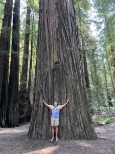 Williams Grove is the main attraction here, it’s  filled with massive old growth behemoths that are awe-inspiring and almost impossible to describe. The morning we arrived, we were the only ones here. Sunlight slanted down through the canopy creating cross hatches of soft, yellow light on the tree trunks and the forest floor. Everywhere, enormous trees towered above us. Our footsteps were muffled by the thick understory, we walked in reverent silence, breathing in the antiquity and the wisdom of the trees; we were in a holy place and walking here felt like praying. These trees are not only tall but wide. Carol and I attempted to measure the girth of one of these giants, it took us eight arm lengths to encircle the tree…that’s 48 feet!! We saw several trees that were even larger than this one. Of course hugging one of these miracles of nature is a requisite ritual. I spread my arms across the face of one such tree, looking up I could see the thick ridges of it’s trunk disappear into the canopy high above me, I felt the roughness of her bark on my cheek, my heart and the heart of this tree were beating as one.